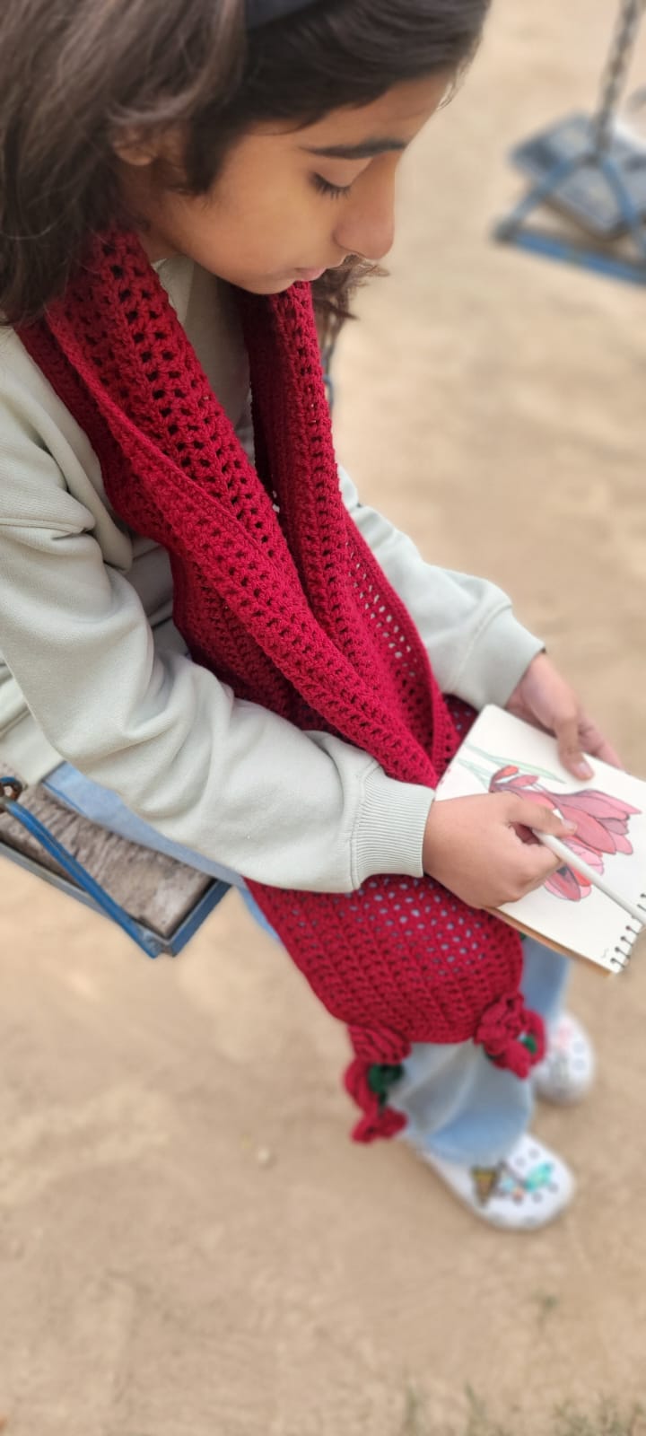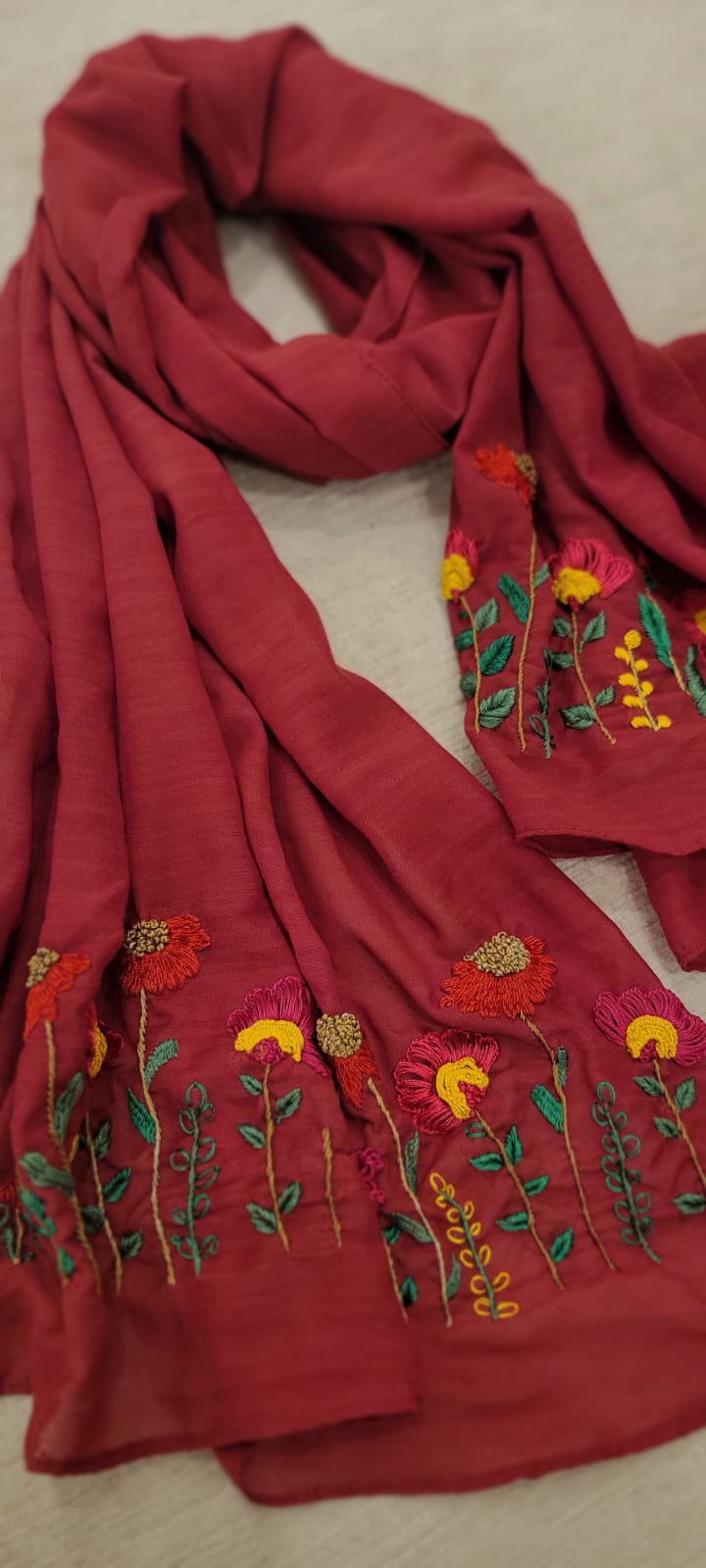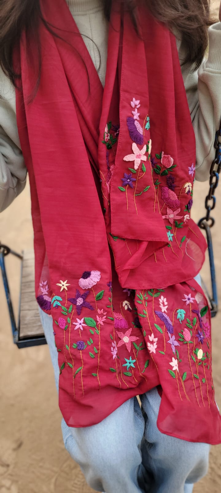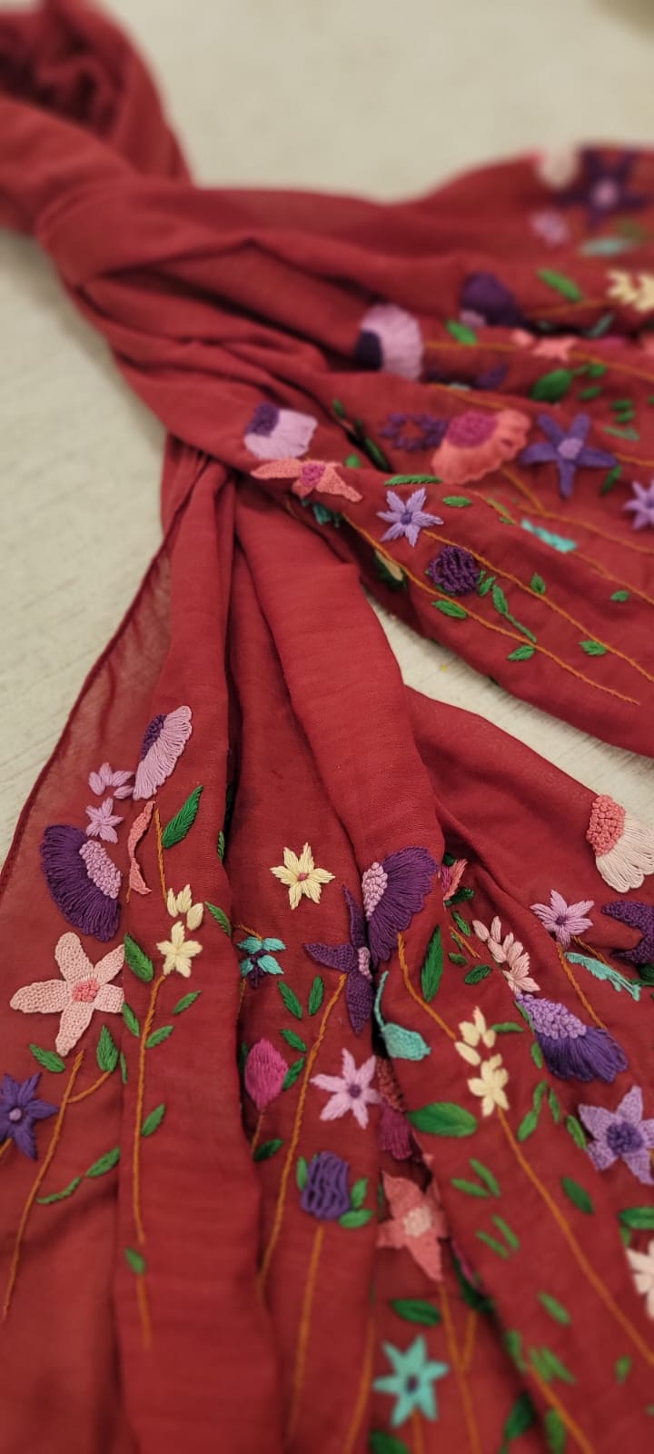 Red wool scarf with floral accents